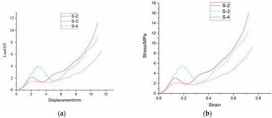 The quasi-static compression testing platform with a DCL-100 electronic universal testing machine was applied to test the load–deformation data of three types of foam-nickel specimens, respectively, as shown in Figure 20a. Stress–strain curves of three types of constitutive models of foam-nickel were established according to the load–deformation test data, as shown in Figure 20b.