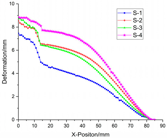 To illustrate quantitatively the deformation extent of the foam-nickel sandwich structure under the blast load, the reference coordinate system of the deformation measurement of sandwich structure is established, as shown in Figure 6a, where the zero point coordinate is selected as the centre of the circle of the bottom panel of the sandwich structure. When measuring, the deformation progression of the foam-nickel core material is measured with the centre as the zero point and 5 mm as the gradient. Figure 6b shows the position–deformation data of the foam-nickel core, displaying the rapid decline tendency of deformation amount with the increase in X location. Figure 6c shows the position–deformation data of the bottom panel as well.