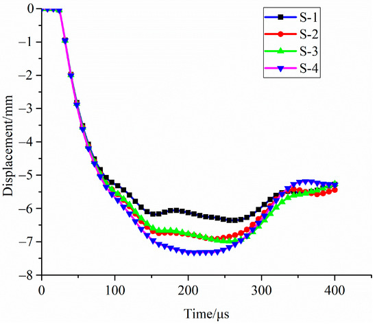 After the simulation, the deformation–time characteristic curve of the upper panel of sandwich structure under blast load was established. Under blast load, the deformation time of the top panel with the protection of sandwich structure based on foam-nickel core material is shown in Figure 24.