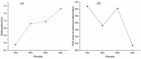Relationship between deformation of top panel and porosity of foam-nickel core: (a) deformation porosity characteristics; (b) time point of maximum deformation porosity characteristics.