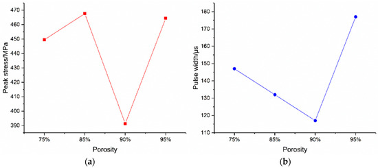 Relationship between stress of bottom panel and porosity of foam-nickel core. (a) Relationship between peak stress and porosity. (b) Relationship between stress pulse width and porosity.
