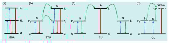 Schematic linear upconversion mechanisms operating in isolated molecules: (a) ESA, (b) ETU, (c) CU, and (d) CL. S, sensitizer; A, activator; G, ground state; E1/E2, excited state; blue, linear excitation; green, energy transfers; red, upconverted emission [32].