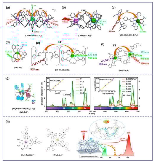 Diagram of organic complexes structures based on the ETU mechanism. (a), the structure diagram of the trinuclear complex [CrErCr(dipy-L4)3]9+ [20]; (b), the structure diagram of [CrEr(py-L4)3]6+ [21]; (c), the structure diagram of [(IR-806-L4)Er(L7)3]+ [37]; (d), the structure diagram of [Er(L6)3] [42]; (e), the structure diagram of [IR-806][Er(L5)4] [18]; (f), the structure diagram of {[Er(L2)]2F}+ [22]; (g), the structure diagram of the discrete bimetallic [Yb2Er]+ and the UCL intensity (545 nm) of [Yb2Er]+ in CH2Cl2 dependent on the quantity of [Bu4N]F under 2 Wcm−2 (left) and dependent on the quantity of [Bu4N]F under 2 Wcm−2 (right) [45]; (h), the structure diagram of [Er(L7)4(L8)2]+ and [Yb(L8)4)]3+ and the emission spectrum of polymer films [46]).
