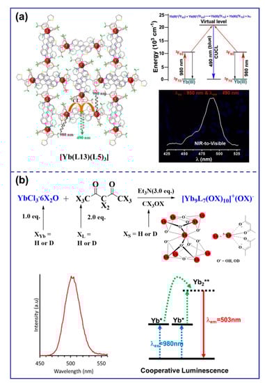 Cooperative luminescence (CL) is a rare UC phenomenon that occurs when the excitation relay with the activator as the center is absent, resulting in its replacement by a virtual emission state [32]. In a case reported in 2019, solid salt [Yb(L13)(L5)3] exhibited visible blue light at 490 nm upon NIR excitation at 980 nm (Figure 5a), which made them promising candidates for NIR-to-visible or NIR-to-NIR cellular imaging probes [51]. In 2021, a surprising case of molecular solution co-luminescence (CL) UC was observed due to the excited states of Yb3+. When the [Yb9L7(OX)10]+ complex was excited by the laser at 980 nm, a symmetric emission band with a maximum at approximately 503 nm was observed in pure CD3OD, which was attributed to the CL originating from Yb clusters (Figure 5b) [19].