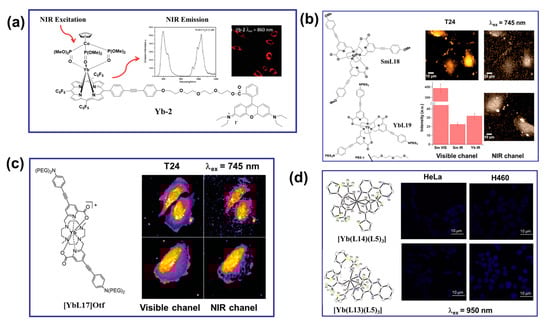 NIR radiation Yb(III) complexes have garnered significant attention in the field of multiphoton cell imaging. Despite their low luminescent quantum yield, Yb(III) complexes allowed excitation and emission in both the NIR-to-visible and NIR-to-NIR configurations [64,65]. NIR excitation by UC minimizes the scattering and autofluorescence from biological media, enhances the S/N ratio, and enables deep tissue penetration for imaging and bioanalysis [64,65,66]. In 2011, Wong and co-workers reported an Yb complex with exceptional luminescence properties in water and a remarkable two-photon cross-section. Interestingly, this complex was successfully utilized as a biological probe for imaging HeLa cells by two-photon microscopy, operating in the classic NIR-to-visible configuration for detection of residual ligand central emission (Figure 6a) [67]. Complexes [YbL16] were also identified as a 2P NIR biological probe with an emission wavelength of 980 nm, demonstrating a promising thick-tissue imaging probe [68]. In 2015, Maury et al. synthesized a samarium complex [SmL15] structurally similar to [YbL16]. The stained fixed cells could be imaged in the visible light and NIR spectrums. Under the same conditions, the 2P images obtained by [SmL15] in the NIR spectrum showed a similar distribution to that obtained with [YbL16] (Figure 6b) [69]. As shown in Figure 6c, in 2017, Maury et al. prepared Yb(III) complexes ([YbL17]Otf) based on the dimethyl cycline macrocyclic ligand and obtained high-quality images in both the classic NIR-to-vis configuration and the more challenging NIR-to-NIR configuration [70]. Yb(III) complexes offer potential for biological imaging and serve as effective light therapy agents for deep tissues due to their NIR excitation and emission and unique cooperative upconversion luminescence properties. In 2019, Patra and co-workers designed double-sensitized (L14/L13 and L5) Yb(III) complexes to modulate the desirable optical properties in the NIR region for bioimaging (Figure 6d) [51]. The cytosolic and nuclear localizations were monitored by utilizing their unique and intrinsic cooperative upconversion luminescence of Yb(III) ions in the NIR-to-visible region (λex = 950 nm) and multiphoton excitation (λex = 750 nm) using confocal fluorescence microscopy in HeLa and H460 cancer cells. The cellular uptake studies clearly demonstrated the cytoplasmic and nuclear localization of the complex. The NIR cytotoxicity of [Yb(L13)(L5)3] upon continuous 980 nm irradiation by a laser demonstrated its potential for PDT. These results provided an intelligent strategy for the development of light-responsive, highlight-stable Yb(III) probes for NIR therapy applications in biologically transparent phototherapeutic windows [51].