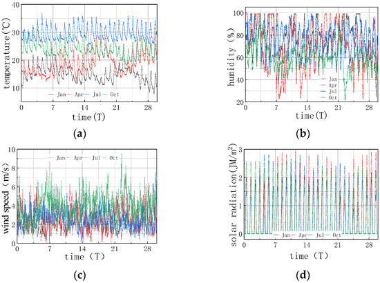 It can be seen from Figure 4 that the overall summer climate in Xiamen was characterized with high temperature and high humidity, with a highest temperature of 36.6 °C and a lowest temperature of 24.9 °C; the diurnal temperature difference was not large due to the regulation of ocean temperature. The humidity in Xiamen varied greatly in July, with the highest value being 99% and the lowest being 48%. The summer windspeed and solar radiation in this area were relatively large, with a daily maximum solar radiation of 2.8 MJ/m2 and a windspeed of 7.5 m/s. The environmental temperature, humidity, windspeed, and solar radiation in January, April, July, and October all changed during day and night, with varying amplitudes, and the temperature changed prominently between the four seasons.