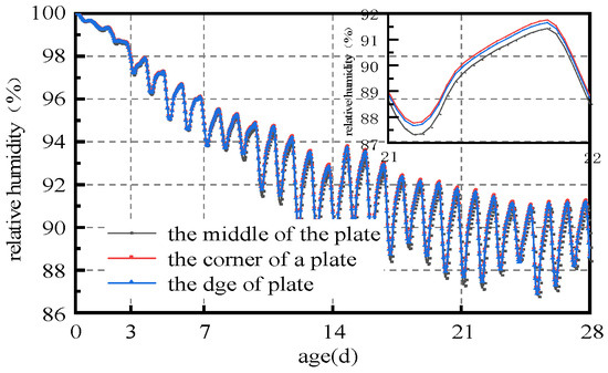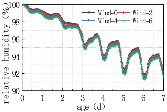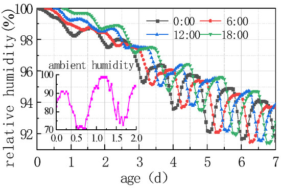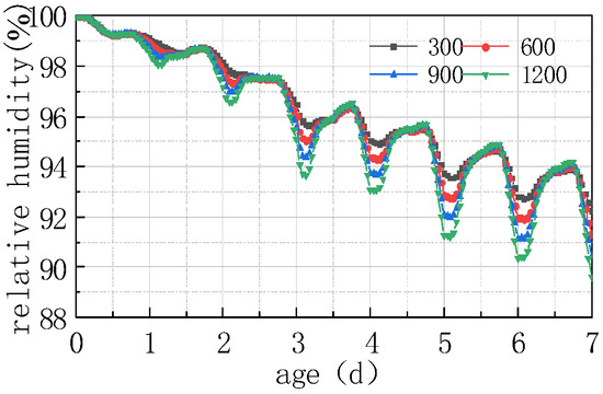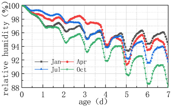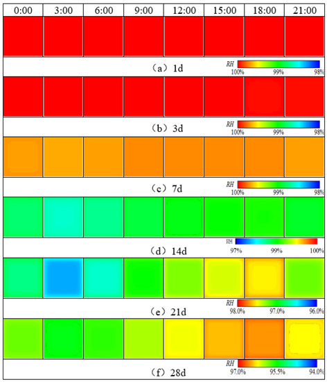 (1) As can be seen from Figure 5 and Figure 7, the humidity field in the first 3 days had a linear relationship with time, and the relative humidity of the slab gradually decreased with time. After 3 days, the humidity field changed periodically with the environmental field. The reason is that the internal hydration reaction of concrete in the first 3 days had a greater impact on the humidity field than that of the external environment. The variation in the humidity field mainly came from the hydration reaction, which consumed its own moisture and gradually reduced humidity. After 7 days, the humidity field was relatively low from 15:00 h to 21:00 h, and relatively high from 6:00 h to 12:00 h, indicating that the variation in the internal humidity field of the concrete after 7 days was dominated by the environmental field. The environment field was characterized by high temperature, low humidity, and large solar radiation from 11:00 h to 17:00 h, while from 0:00 h to 6:00 h it was characterized by low temperature, high humidity, and no solar radiation. However, the humidity field had a certain time lag compared with the environmental field.