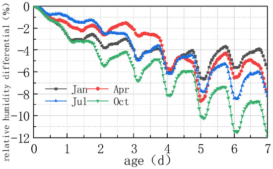 (1) The environmental humidity field had a significant impact on the humidity field of the pavement. Under different humidity conditions, the relative humidity value in January at 7 days was the highest, with an RH of 94.328%. The RH in April was similar to that in July, reaching approximately 91%, and the relative humidity value in October was the lowest, with an RH of 88.128%. The relative humidity difference in January was the smallest, with the absolute value of ΔRH being 5.672%. The relative humidity difference was the largest in October, with the absolute value of ΔRH being 11.872%. The results were consistent with the monthly humidity laws in Figure 10.