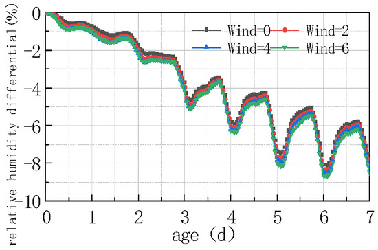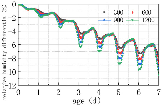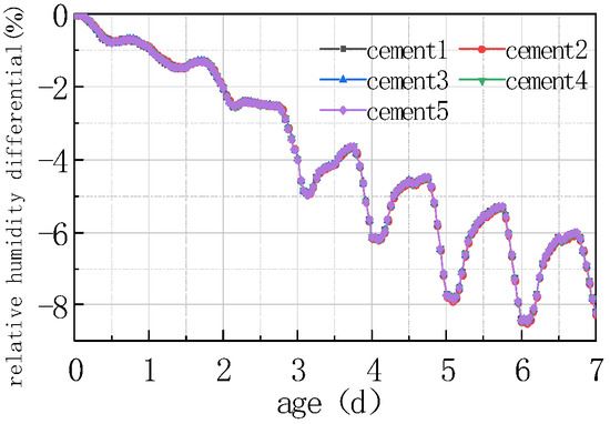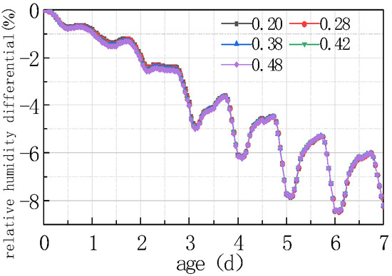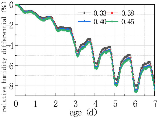 Shown in Figure 17 and Figure 18 is the relative humidity difference between the top and bottom of the concrete slabs under different water–cement ratios.