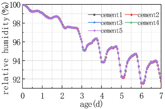The influence of cement type on the humidity field of the concrete pavement slabs was mainly reflected in the aspect of heat release from cement hydration. Nevertheless, cement hydration mainly occurred before concrete setting, at which time the relative humidity value inside the concrete was relatively high and generally in a saturated state. The temperature difference generated by the heat release from the hydration of different types of cement on the inside of the concrete was insufficient to exert an obvious impact on the relative humidity, namely, there was a phenomenon that the relative humidity curves of different types of cement concrete pavement slabs basically overlapped.