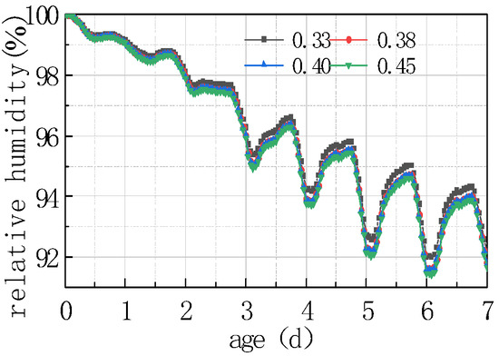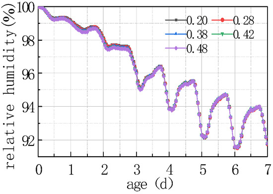 It can be seen from the above figure that the relative humidity at the top of the concrete slab decreased with the water–cement ratio, and the relative humidity difference between different water–cement ratios was more significant with time. The law of the relative humidity difference between the bottom and the top of the slab was the same as the relative humidity at the slab top. The reason is that the increase in water–cement ratio led to an increase in free water content in the concrete, thereby accelerating the hydration of the cement, as well as enhancing the heat generated by hydration, resulting in an increase in the internal temperature of the concrete, and accelerating the evaporation of water. The combined action of the two effects would reduce the humidity on the top of the concrete slab. The curve after 2 days mainly reflected the humidity exchange between the concrete slab and the external environment. The lower the relative humidity of the slab top was, the more obvious the humidity exchange was. The curve reflected that the relative humidity of the slab top varied periodically with environmental humidity. The relative humidity difference between the peaks and troughs of different water–cement ratios slightly increased with time, but the amplitude was not significant. The findings of this study are in agreement with those reported by Khan et al. [29] wherein the impact of traditional and five types of pozzolanic materials were explored under hot weather conditions. They revealed that some pozzolanic materials including fly ash, ground granulated blast-furnace slag, Superpozz, and natural pozzolan when blended in optimum dosage with Portland cement enhance the early stage and later stage characteristics of concrete due to their slow pozzolanic reactivity in the early period, which prevents the formation of sudden and nonuniform gel products, making them ideal candidates for aggressive environmental conditions. Further, they also emphasized that proper field curing, including wet burlap and application of one-time curing compound, results in a durable concrete.