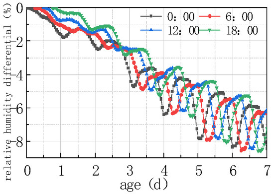 (3) The relative humidity curve at the top of the slab at different pouring times gradually increased with time. As can be seen from Figure 21, in the first 7 days, the superposition of peaks and troughs of each curve occurred on the sixth day, with the maximum difference being 3.466% of the curve difference between 18:00 and 06:00, which was the same with the peak and trough time of the humidity curve.