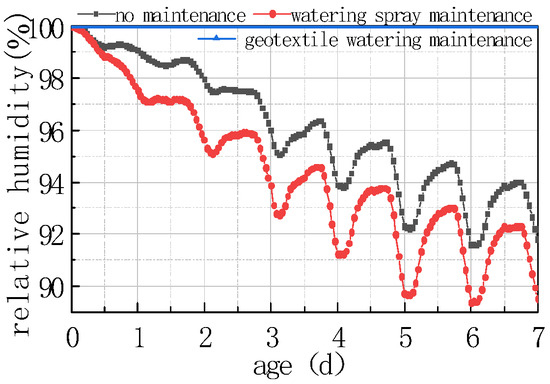 (3) During geotextile + water curing, the relative humidity of each part inside the concrete slab was 100%, which was the most ideal state for concrete strength growth and internal stress.