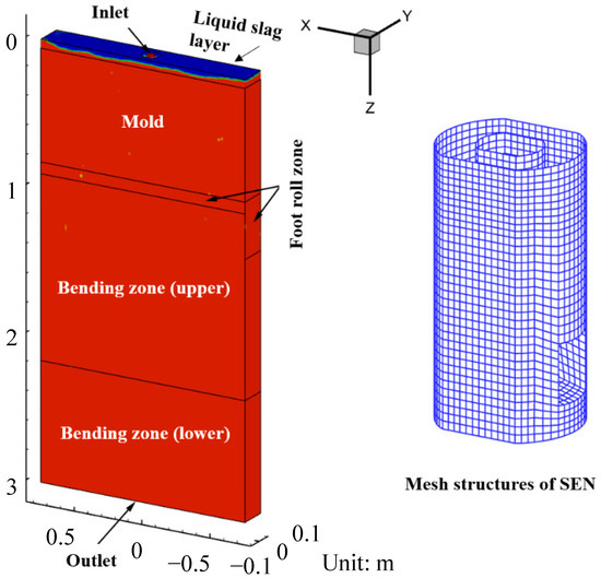 - The computational domain extends from the mold to the bending zone, and its direction is simplified to vertical downward;