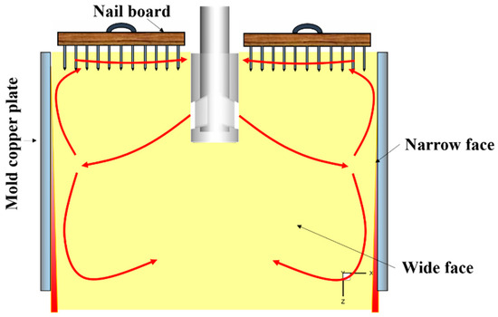 In order to validate the accuracy of the numerical method, the nail board measurement was adopted to measure the surface velocity of the molten steel in the industrial CC mold [34,35,36]. Figure 2 shows the schematic of the nail board measurement. In the experiment, the nail board was inserted into the molten steel vertically through the mold powder layer, and it stayed for 3~5 s before being pulled out. The depth of the steel nail inserted into the molten steel was in the range of 40~60 mm. The nail board measurement was carried out simultaneously on both sides of the SEN. The surface velocity of molten steel can be calculated by measuring the height difference between the incoming direction and the de-flow direction of the molten steel, and the diameter of the solidified lump at the lowest point of the de-flow direction. The calculation equation of the surface velocity is as follows [25]: