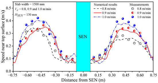 In order to verify the accuracy of the mathematical model, the measured and calculated speed of molten steel along the thickness center line of the top surface of the mold are compared, as shown in Figure 3. The numerical simulation results were in good agreement with the measured values. Therefore, the fluid flow mathematical model established in the current study can be used to predict the molten steel flow in the mold.