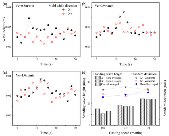 Variation in standing wave height with time at different casting speeds. (a) Vc = 0.8 m/min; (b) Vc = 0.9 m/min; (c) Vc = 1.0 m/min; (d) Standing wave height and standard deviation.