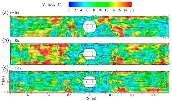 Figure 6 illustrates the transient velocity and vortex distribution on the top surface of the mold at 0.9 m/min casting speed. The surface velocity showed a clear asymmetric distribution under transient conditions. The velocity had a significant peak, and the value of the peak varied with the casting time. The peak value of the surface velocity appeared on the right side of the SEN at t = 0 s and on the left side of the SEN at t = 8 s along the mold width, as shown in Figure 6a,b, respectively. In Figure 6c, the peak value decreased, and the velocity distribution tended to be moderate at t = 16 s.