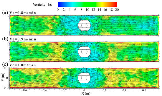 Distribution of time-averaged (30 s) velocity and vortex distribution on the top surface of the mold at different casting speeds. (a) Vc = 0.8 m/min; (b) Vc = 0.9 m/min; (c) Vc = 1.0 m/min.