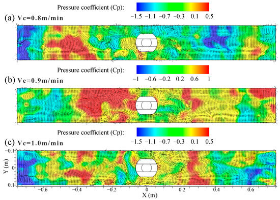 The distribution of time-averaged pressure coefficient on the top surface of the mold at different casting speeds is shown in Figure 10. The relative pressure of the top surface is expressed by the pressure coefficient, Cp, and the equation is given by
