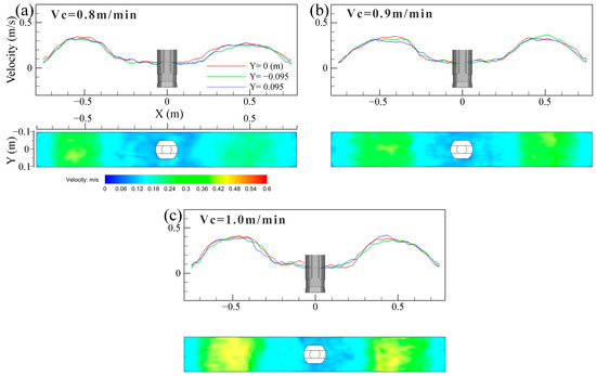Distribution of time-averaged (30 s) velocity of molten steel near the top surface of the mold at different casting speeds. (a) Vc = 0.8 m/min; (b) Vc = 0.9 m/min; (c) Vc = 1.0 m/min.