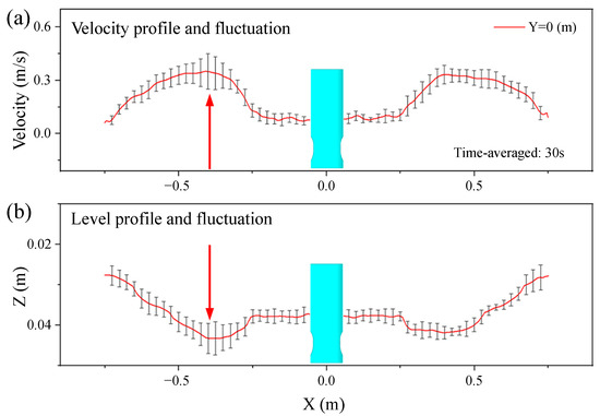 Distribution of velocity profile, level profile, and fluctuation on the top surface along the mold thickness center. (a) Velocity profile and fluctuation; (b) Level profile and fluctuation.