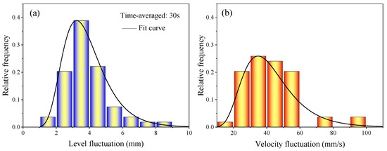 Relative frequency distribution of liquid level fluctuation and velocity fluctuation magnitude on the top surface of the mold. (a) Liquid level fluctuation; (b) velocity fluctuation.
