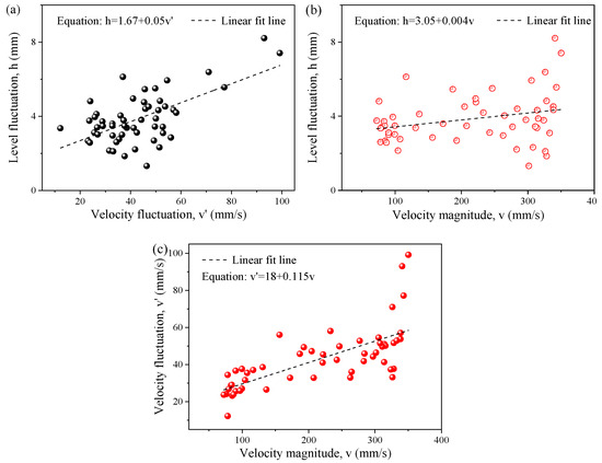 Relationship between the surface velocity, surface velocity fluctuation, and liquid level fluctuation. (a) Velocity fluctuation and level fluctuation; (b) velocity magnitude and level fluctuation; (c) velocity magnitude and velocity fluctuation.