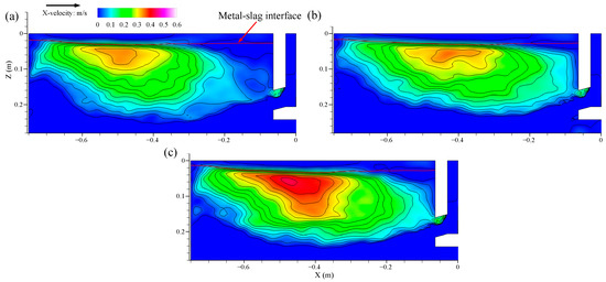 Comparison of the velocity gradient at the X-axis of slag–steel interface at different casting speeds. (a) Vc = 0.8 m/min; (b) Vc = 0.9 m/min; (c) Vc = 1.0 m/min.