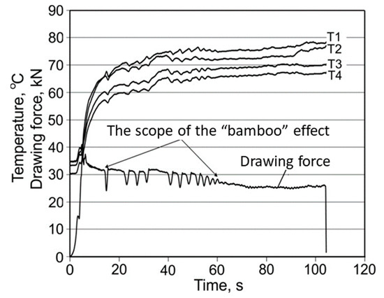 When the “bamboo” effect occurred, which presented a periodic build-up on the tube surface (Figure 5a), an oscillation of temperature was observed (Figure 3). The temperature curves are composed of characteristic “teeth”, corresponding to the oscillations of the drawing force, starting and ending with the “bamboo” effect.