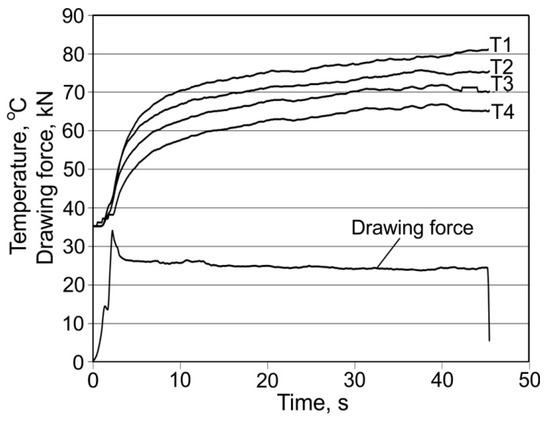 Variation in temperature and drawing force for the die angle α = 16° and plug angles β = 13° and 14° are similar to the curves shown in Figure 4. When drawing using dies with an angle α = 16° and plug angle β = 13°, first, a clear decrease and then an increase in drawing force occur with an increase in drawing velocity. The strongest force Fmax = 34.1 kN was for the velocity vc = 1 m/min, while the weakest force Fmax = 29.1 kN was for a velocity v = 2 m/min (Table 1). For the velocity vc = 4 m/min, there is an increase in drawing force to the value of Fmax = 31.3 kN. For angles α = 16° and β = 13° and velocity vc = 2 m/min, the average drawing force is Fav = 25.2 kN. For drawing with a die angle α = 16° and plug angle β = 14°, an increase in drawing velocity causes a decrease in the maximum drawing force, which takes the value Fmax = 28.6 kN for vc = 1 m/min and Fmax = 25.3 kN for velocity vc = 4 m/min (Table 1).