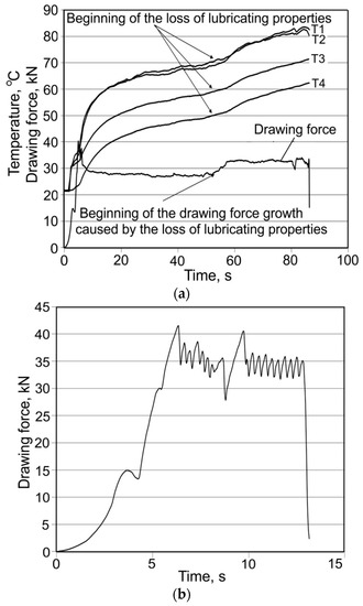 A characteristic feature of the loss of lubricant properties was a clear increase in the temperature in the die and a corresponding increase in force (Figure 6a). Thus, a clear deterioration in physical properties and the viscosity of the lubricant under the influence of an increase in temperature can be observed in the deformation zone, revealing a rupture of the lubricant film and an increase in the drawing force.