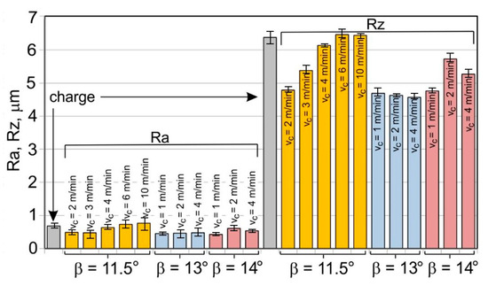 The results of the mean roughness Ra and Rz measured on the inner and outer surfaces of the tubes, depending on the angle of the floating plug and the drawing speed, are presented in Table 4 and Figure 7 and Figure 8. Surface roughness parameters were measured on the tubular surfaces in the axial direction.