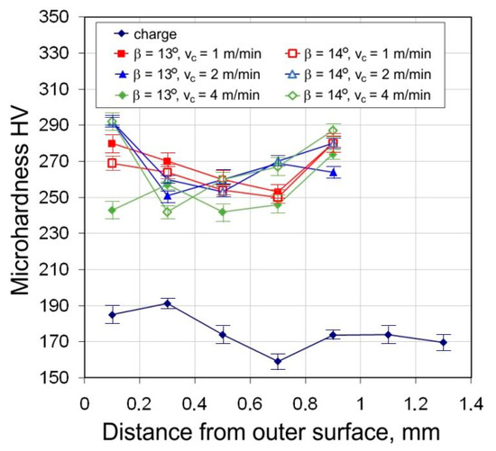Micro-hardness across the tube cross section (D = 19 mm, α = 16°, (W) lubricant).