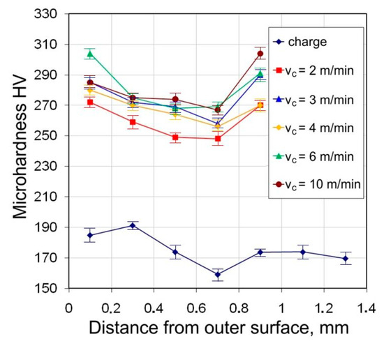 Effect of drawing speed vc on the microhardness across the tube cross section (D = 19 mm, α = 16°, β = 11.5°, (W) lubricant).
