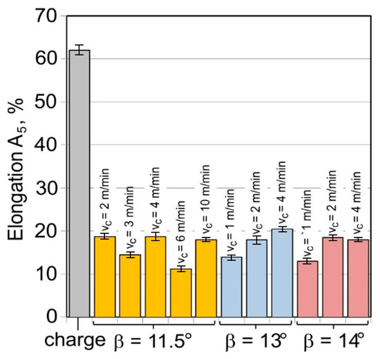 The ultimate tensile stress of the tubes after drawing is almost doubled as compared to the charge material (Figure 11). On the other hand, plastic properties decrease more than three times (Figure 12), which proves a significant work hardening of the material has taken place during the drawing process.