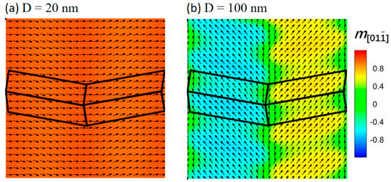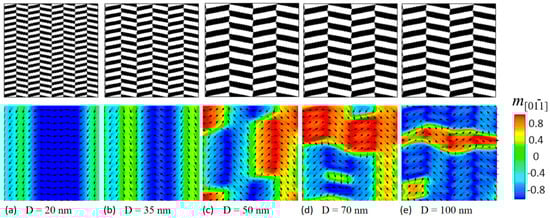 In the chessboard structure, the L10 tiles with high magnetic hardness are interconnected by the magnetically soft L12 tiles in between. These L10 tiles alternate between in-plane easy directions of and , as illustrated in Figure 1. The strength of the exchange coupling is highly dependent on the tile size. To systematically investigate the exchange coupling effect in nonstandard nanochessboards, we considered the same aspect ratio but different cell sizes. Figure 2 displays the phase morphologies and phase-field simulated initial magnetization distributions for nonstandard nanochessboards with the same aspect ratio of b/a = 4 but varying cell sizes from D = 20 nm to 100 nm. Generally, as the cell size increases, the exchange coupling effect weakens. For relatively small unit cells, the strong exchange coupling causes significant deviations of magnetizations from the easy axis of the hard L10 phase, resulting in the emergence of a new easy axis, as depicted in Figure 2a,b. On the other hand, for relatively large unit cells, the weakened exchange coupling only induces slight rotations of magnetizations around the easy axis of the hard L10 phase, as shown in Figure 2c–e. To provide a clearer illustration of the magnetization behaviors, we simulated the magnetization distributions for -poled nonstandard nanochessboards with two representative unit cell sizes of D = 20 nm and D = 100 nm, as presented in Figure 3.