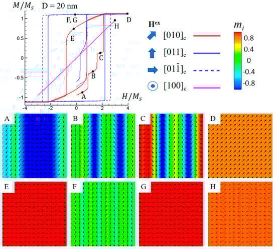 Simulated magnetic hysteresis loops and domain structures of Co−Pt nonstandard nanochessboard system with unit cell size of D = 50 nm under external magnetic field in , , or [100] directions. Refer to Figure 4 for the meaning of colored lines. Black arrows represent in−plane magnetization components and color contours the component for points (A–F), and the [100] component for points (G,H).
