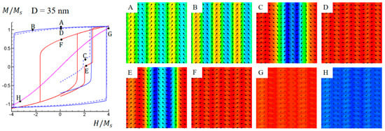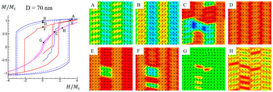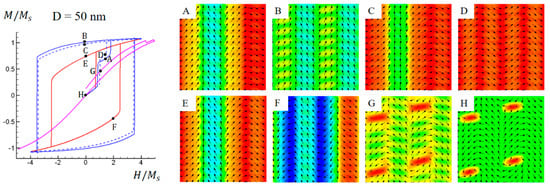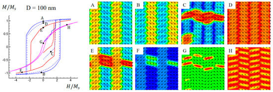 Simulated magnetic hysteresis loops and domain structures of Co−Pt nonstandard nanochessboard system with unit cell size of D = 35 nm under external magnetic field in , or [100] direction. Refer to Figure 4 for the meaning of colored lines. Black arrows represent in−plane magnetization components and color contours the −component for points (A–F) while [100]−component for points (G,H).