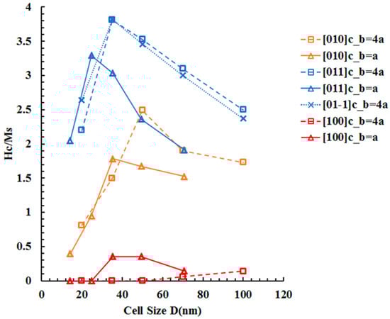 The simulated hysteresis loops in Figure 4, Figure 5, Figure 6, Figure 7 and Figure 8 demonstrate that the magnetic coercive field has a strong dependency on the cell size D. To further examine the exchange coupling effect on magnetic coercivity, we plotted the simulated magnetic coercive field as a function of unit cell size D for both standard (b = a) and nonstandard (b = 4a) Co-Pt nanochessboards under external magnetic fields in different directions, as shown in Figure 9. Firstly, both standard and nonstandard nanochessboards exhibit similar behaviors of coercivity under in-plane magnetic fields. As the cell size D increases, the coercivity initially increases and then decreases. This universal behavior can be explained by considering the magnetization rotation path under the magnetic field, which depends on the tile size. For relatively small tile sizes, the magnetization rotation follows Path I, where the hard–hard exchange coupling is so strong that the magnetizations of neighboring hard L10 phases are bonded together. This bonding enables easy rigid-body rotation against the original magnetocrystalline anisotropy energy. The smaller the tile size, the stronger the binding effect. Consequently, as the tile size decreases, the effective anisotropy is reduced, leading to a smaller coercivity. For relatively large tile sizes, the magnetization rotation follows Path II, where the hard–hard exchange coupling is weak enough to allow the magnetizations of neighboring hard L10 phases to rotate separately. The larger the tile size, the easier the separate rotation. Therefore, as the tile size increases, the splitting energy is reduced, resulting in a smaller coercivity. The magnetic coercivity behavior observed in Co-Pt nanochessboards with varying tile sizes is consistent with the corresponding experimental measurements [23].