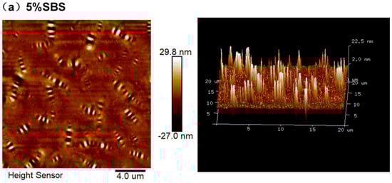 In order to investigate the impacts of various modifiers on matrix asphalt, atomic force microscopy was utilized in this work to examine the surface morphology and micromechanical characteristics of various modified asphalt cement samples in light percussion mode. The microscope probe used was the Bruker Tap 150A probe (Billerica, MA, USA). The resonance frequency was 75 kHz, the radius was 20 nm, the scanning frequency was 1 Hz, the scanning range was 20 × 20 μm, the number of scanning points was 256 × 256 in the scanning range, and the stiffness was 5 N/m.
