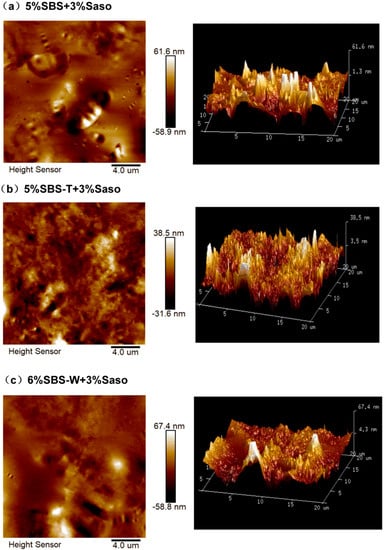 Figure 2 manifests a two-dimensional atomic diagram and the 3D topography of the warm-mixed polymer-modified asphalt obtained using the Nanoscope Analysis software v180r1. It is found from the image that the warm-mixed modified asphalt did not have a complete bee structure after the addition of Sasobit, and the fluctuation degree of the asphalt surface increased. Moreover, there are large color differences between different areas, and the “bee structure” of the SBS-modified asphalt with warm mixing speed melting is more dispersed and broken. The results demonstrate that the fatigue resistance of the SBS-modified asphalt with warm mixing speed melting was better [29,30].