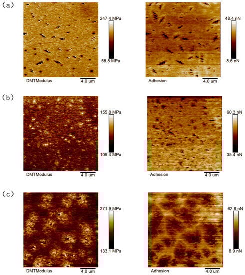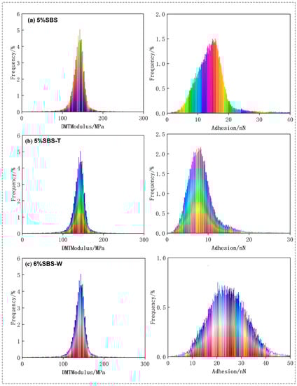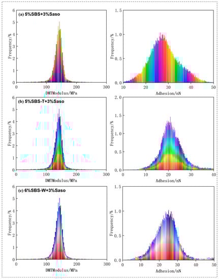 Histogram of DMT modulus and adhesion data distribution of modified asphalt. (a) SBS; (b) SBS-T; and (c) SBS-W.