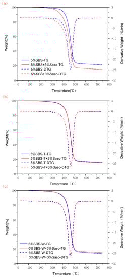 To test the thermal stability of modified bitumen, a thermogravimetric test was performed in this study using a synchronous thermal analyzer (STA449F3 Jupiter) produced by NETZSCH, Selb, Germany, under the following conditions: a sample mass of 10 mg, a nitrogen atmosphere, a test temperature scanning range of 30–750 °C, and a heating rate of 20 °C/min. Following the weighing of 10 mg of modified bitumen samples using a highly accurate balance, the samples were then put into the test device’s crucible before the system was filled with nitrogen and the heating rate was adjusted. The test was conducted as follows: a modified asphalt sample weighing approximately 10 mg was weighed using a high-precision balance before being placed in the instrument’s crucible, followed by a thorough vacuuming of the system before nitrogen was added and the rate of temperature rise was adjusted. The TG tests were carried out according to ASTM E2550 [28].