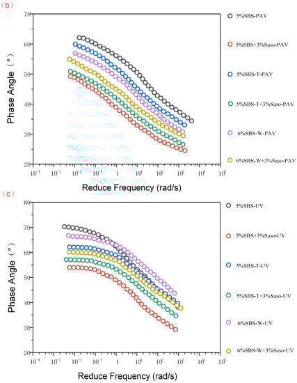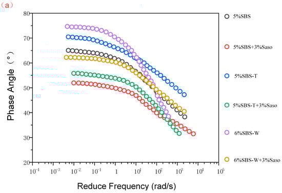 - The phase angles of the six modified asphalt cements under four conditions tended to decrease with an increase in frequency, which was determined by the rheological properties of the asphalt materials. With the increase in frequency, the load time became shorter, and the asphalt deformation was mainly elastic deformation, which was shown in the data as a gradually decreasing phase angle [32].