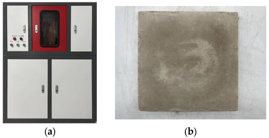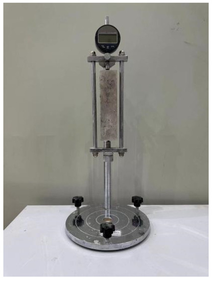 According to standards [30,31,32], the fluidity, dry density, water absorption, and softening coefficient of AASR foamed concrete were determined. As shown in Figure 1, with reference to JG/T 266-2011 [30] and GB/T 17671-2021 [33], the compressive strength of the AASR foamed concrete with a size of 100 mm × 100 mm × 100 mm and the flexural strength of the AASR foamed concrete with a size of 40 mm×40 mm×160 mm are measured with a YAW-2000 electro-hydraulic servo pressure testing machine. With reference to GB/T10294 [32], the ADH3030 thermal conductivity tester (as shown in Figure 2) is used to measure the thermal conductivity of the AASR foamed concrete with a size of 300 mm × 300 mm × 30 mm. An SP-175 vertical shrinkage dilatometer (as shown in Figure 3) was used to measure the 3, 7, 14, 21, 28, and 56 d dry shrinkage values of the AASR foamed concrete with a size of 40 mm × 40 mm × 160 mm.