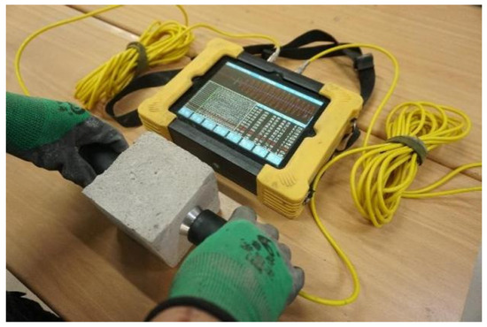 Ultrasonic testing is an effective non-destructive testing method. The HU-U81 concrete ultrasonic detector was used to measure the wave velocity of the AARS foamed concrete before and after freezing and thawing, as shown in Figure 4. The relative dynamic elastic modulus of the concrete specimen was calculated according to Equations (1) and (2):