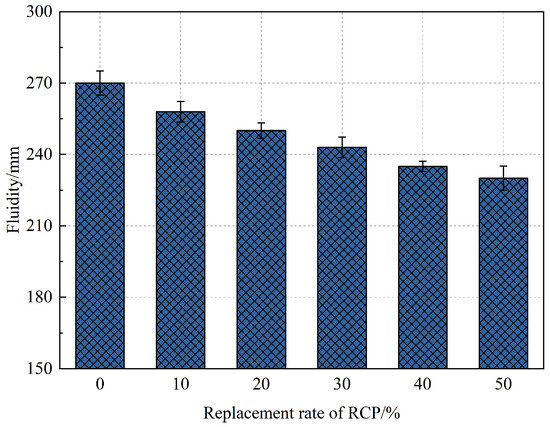 The fluidity results of the AASR foamed concrete under different RCP replacement rates are shown in Figure 5. With the increase in the RCP content, the fluidity of the AASR foamed concrete decreases gradually. Compared with the fluidity of AASR0 (270 mm), the fluidity of AASR10, AASR20, AASR30, AASR40, and AASR50 decreases by 4.4%, 7.4%, 10.0%, 13.0%, and 14.8%, respectively. This is mainly because the surface of the RCP is rough and there are numerous interconnected voids inside. The addition of RCP will increase the water absorption capacity in the foamed concrete slurry, resulting in excessive internal friction resistance of the slurry, thus reducing the fluidity of the slurry [36,37].