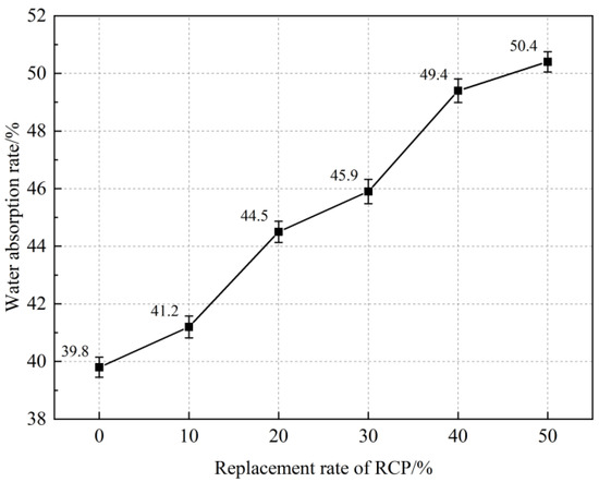Figure 6 shows the influence of the RCP content on the water absorption of the AASR foamed concrete. It can be seen from Figure 6 that the water absorption of the AASR foamed concrete gradually increases with the increase in the RCP content. When the RCP content is 10%, 20%, 30%, 40%, and 50%, the water absorption of the AASR foamed concrete is 3.5%, 11.8%, 15.3%, 24.1%, and 26.6% higher than that of AASR0. This is because the porous structure of RCP will increase the capillary effect of the AASR foamed concrete in water [38]; in addition, the activity of RCP is lower than that of slag. With the increase in its content, the amount of the hydration products of the AASR foamed concrete decreases, and the compactness decreases [39].