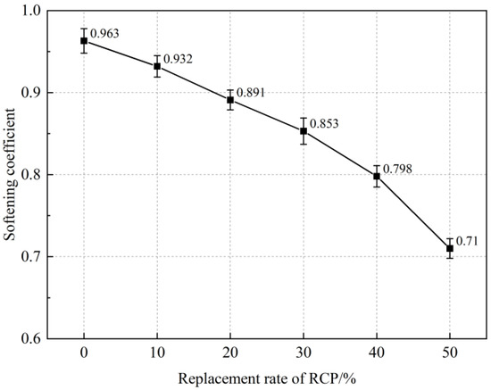 The softening coefficient is an important parameter for the water resistance properties of materials. It can be seen from Figure 7 that the softening coefficient of the AASR foamed concrete gradually decreases with the increase in the RCP content. When the content of RCP increases from 0% to 50%, the softening coefficient of the AASR foamed concrete decreases from 0.963 to 0.710, indicating that adding RCP will have a great impact on its mechanical properties after water absorption; thus, the content of RCP should be reasonably selected according to the actual conditions. The softening of the AASR foamed concrete after water absorption is mainly caused by the addition of RCP, which makes the concrete produce a certain amount of N-A-S-H gel after hydration. The gel structure is prone to hydrolysis due to unstable silicoaluminate bonds, which will cause the overall deterioration in the hardened cement paste, increase the micropores, and then lead to a decline in the macro strength. In addition, when AASR foamed concrete is saturated with water, the moisture migration in the internal pores will lead to a reduction of cohesive forces between crystal particles in the hardened cement paste and poor connection performance [40]. Finally, when AASR foamed concrete is subjected to external forces, the stress generated by the forced migration of internal moisture will cause certain damage to its pore structure, thereby reducing the strength of the AASR foamed concrete.